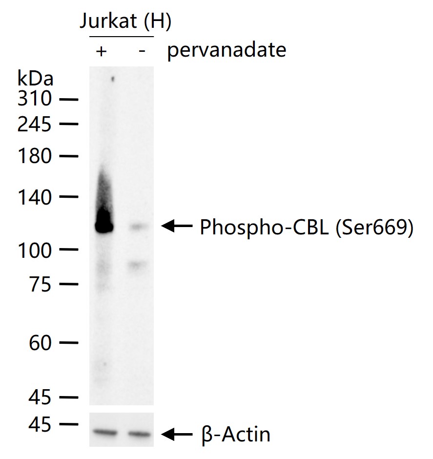 Jurkat (H) cells were treated with or without pervanadate (1nM) for 30 min, 25 μg total protein per lane of cell lysates (see on figure) probed with Phospho-CBL (Ser669) monoclonal antibody, unconjugated (bsm-61355R) at 1:1000 dilution and 4°C overnight incubation. Followed by conjugated secondary antibody incubation at r.t. for 60 min.