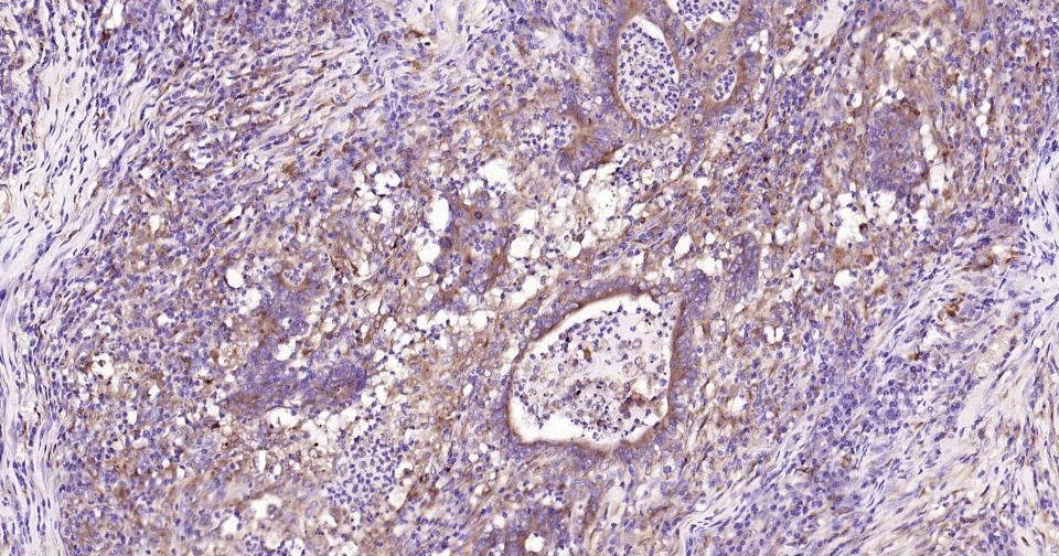 Paraformaldehyde-fixed, paraffin embedded Human Colon Cancer; Antigen retrieval by boiling in sodium citrate buffer (pH6.0) for 15 min; Antibody incubation with Cystatin-C Monoclonal Antibody, Unconjugated(bsm-61363R) at 1:200 overnight at 4°C, followed by conjugation to the SP Kit (Rabbit, SP-0023)and DAB (C-0010) staining.