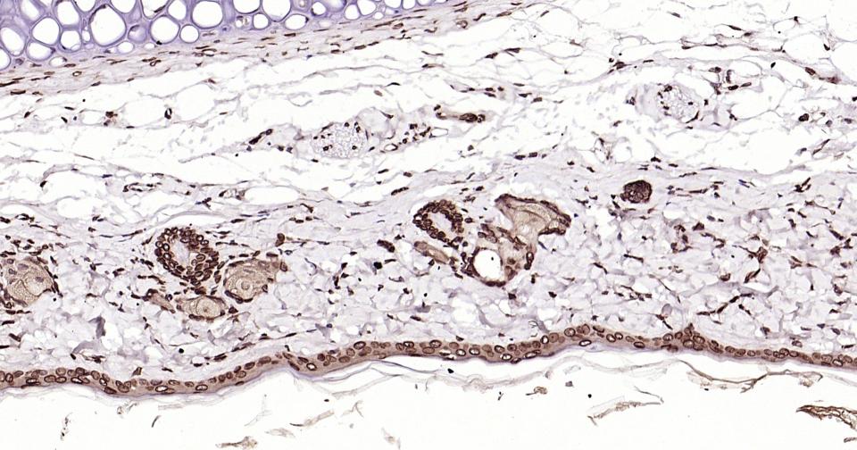Paraformaldehyde-fixed, paraffin embedded Rat Skin; Antigen retrieval by boiling in sodium citrate buffer (pH6.0) for 15 min; Antibody incubation with E2F1 Monoclonal Antibody, Unconjugated(bsm-61369R) at 1:200 overnight at 4°C, followed by conjugation to the SP Kit (Rabbit, SP-0023)and DAB (C-0010) staining.