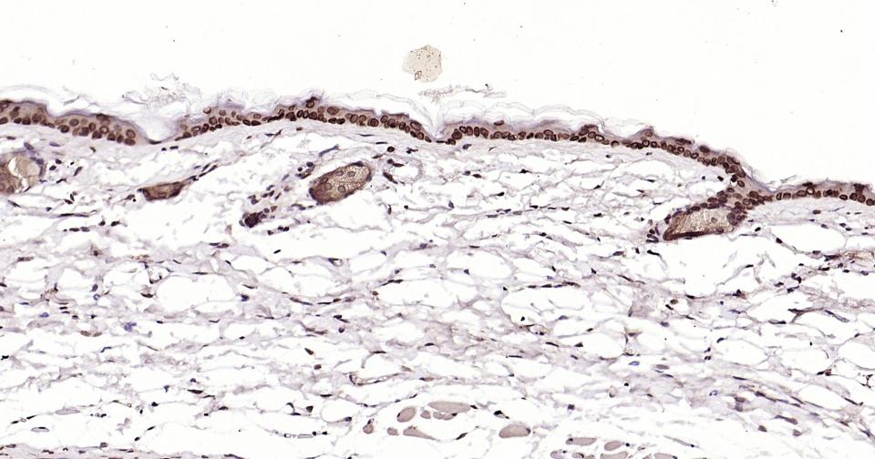 Paraformaldehyde-fixed, paraffin embedded Mouse Skin; Antigen retrieval by boiling in sodium citrate buffer (pH6.0) for 15 min; Antibody incubation with E2F1 Monoclonal Antibody, Unconjugated(bsm-61369R) at 1:200 overnight at 4°C, followed by conjugation to the SP Kit (Rabbit, SP-0023)and DAB (C-0010) staining.