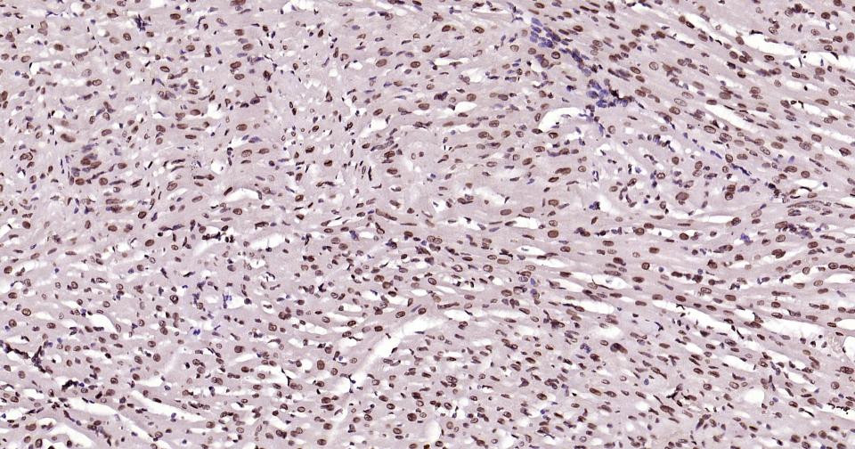 Paraformaldehyde-fixed, paraffin embedded Rat Heart; Antigen retrieval by boiling in sodium citrate buffer (pH6.0) for 15 min; Antibody incubation with E2F1 Monoclonal Antibody, Unconjugated(bsm-61369R) at 1:200 overnight at 4°C, followed by conjugation to the SP Kit (Rabbit, SP-0023)and DAB (C-0010) staining.