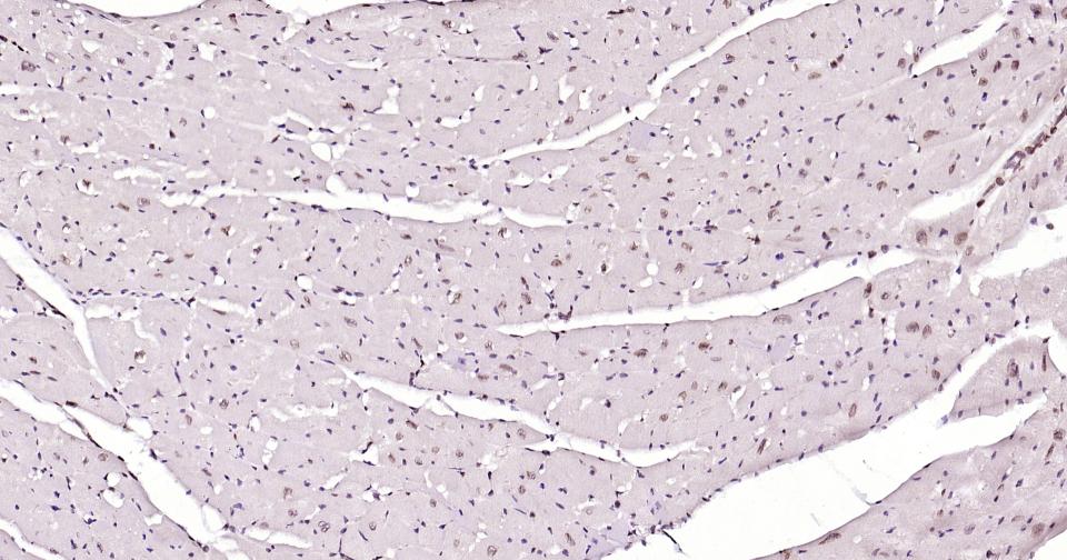 Paraformaldehyde-fixed, paraffin embedded Mouse Heart; Antigen retrieval by boiling in sodium citrate buffer (pH6.0) for 15 min; Antibody incubation with E2F1 Monoclonal Antibody, Unconjugated(bsm-61369R) at 1:200 overnight at 4°C, followed by conjugation to the SP Kit (Rabbit, SP-0023)and DAB (C-0010) staining.