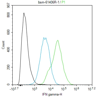 The Jurkat(Treated with PMA (25 ng/mL, 6 h) and ionomycin (1 μg/mL, 6 h), BFA (5 μg/ml, last 5 h)) (H) cells were fixed with 4% PFA (10 min at r.t.) and then permeabilized with 90% ice-cold methanol for 20 min at -20℃,the cells then were incubated in 5%BSA to block non-specific protein-protein interactions (30 min at r.t.).Primary Antibody (green):Rabbit Anti-IFN gamma antibody (bsm-61406R;1:100); Secondary Antibody (white blue): Goat anti-Rabbit IgG-BF488 (bs-60295G-BF488): 1 μg/test. Blank control (black): PBS. Acquisition of 20,000 events was performed.