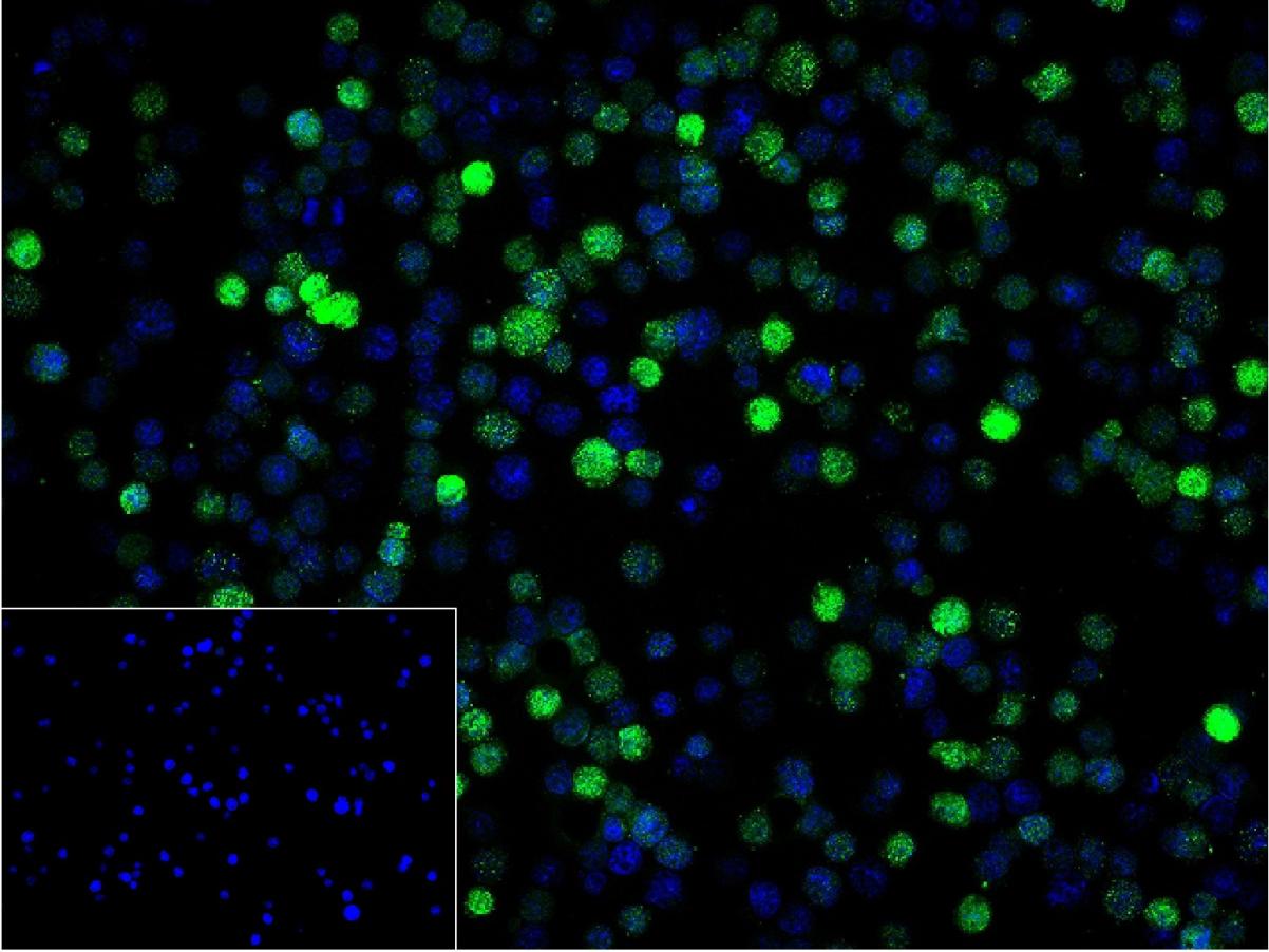 4% Paraformaldehyde-fixed Jurkat(Treated with PMA (25 ng/mL, 6 h) and ionomycin (1 μg/mL, 6 h), BFA (5 μg/ml, last 5 h))(H) cell; Triton X-100 at r.t. for 20 min; Antibody incubation with (IFN gamma) monoclonal Antibody, unconjugated (bsm-61406R) 1:100, 90 min at 37°C; followed by conjugated Goat Anti-Rabbit IgG antibody (green, bs-60295G-BF488) at 37°C for 90 min, DAPI (blue, C02-04002) was used to stain the cell nuclei. PBS instead of the primary antibody was used as the blank control.