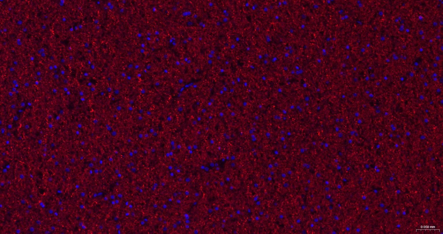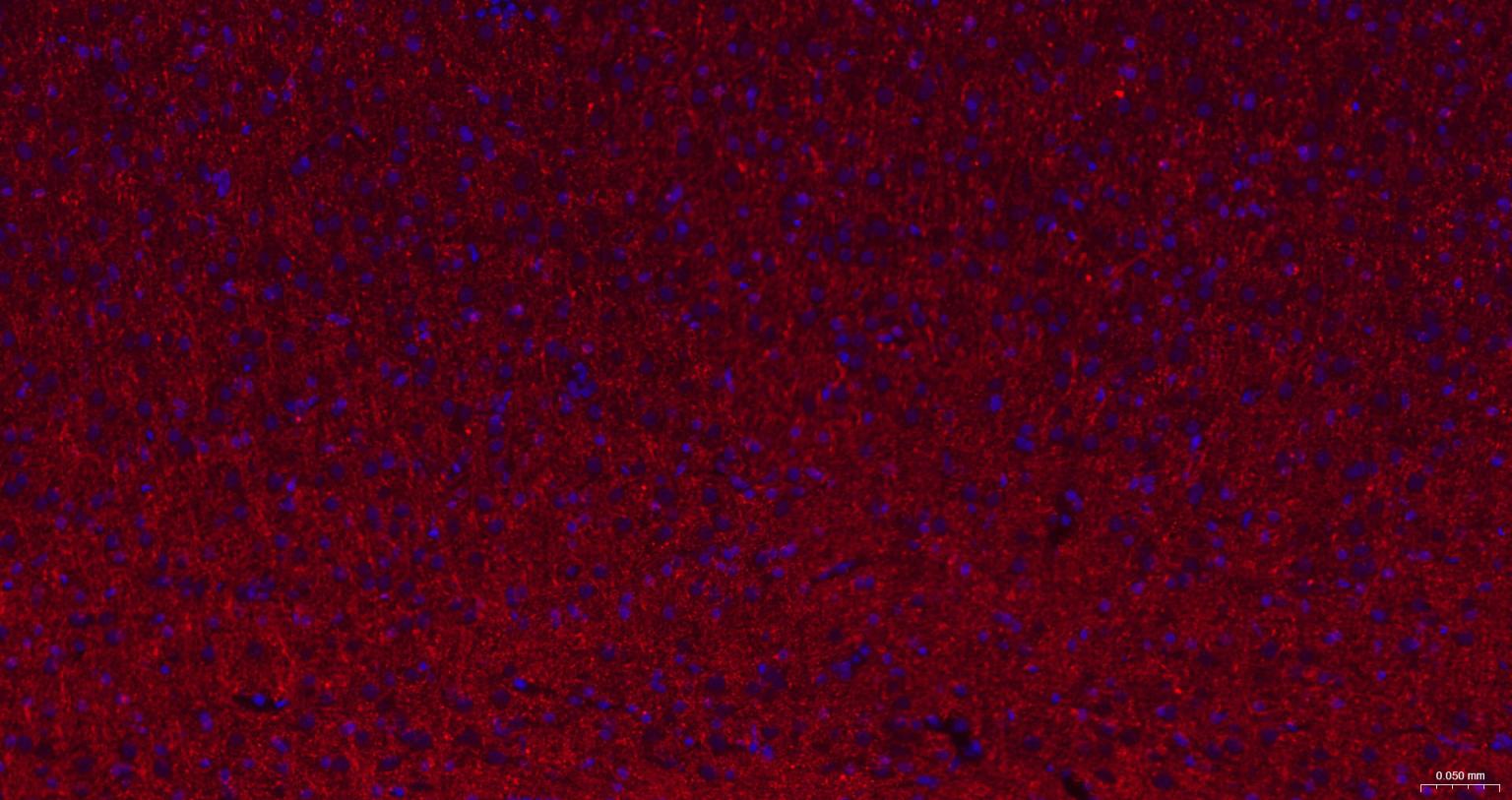 Paraformaldehyde-fixed, paraffin embedded Rat Cerebrum; Antigen retrieval by boiling in sodium citrate buffer (pH6.0) for 15 min; The section was incubated with CNPase Monoclonal Antibody, Unconjugated (bsm-61411R) at 1:200 overnight at 4°C. Followed by conjugated Goat Anti-Rabbit IgG antibody (Red, bs-0295G-BF594), DAPI (blue, C02-04002) was used to stain the cell nuclei.