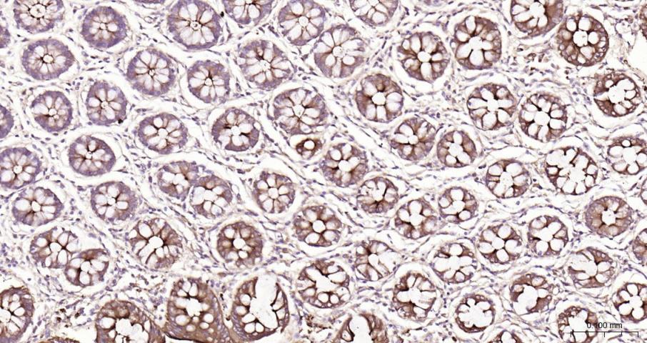 Paraformaldehyde-fixed, paraffin embedded Human Colon; Antigen retrieval by boiling in sodium citrate buffer (pH6.0) for 15 min; Antibody incubation with CEACAM5 Monoclonal Antibody, Unconjugated(bsm-61419R) at 1:200 overnight at 4°C, followed by conjugation to the bs-0295G-HRP and DAB (C-0010) staining.