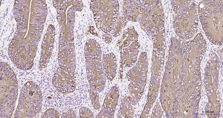 Paraformaldehyde-fixed, paraffin embedded Human Colon Cancer; Antigen retrieval by boiling in sodium citrate buffer (pH6.0) for 15 min; Antibody incubation with CEACAM5 Monoclonal Antibody, Unconjugated(bsm-61419R) at 1:200 overnight at 4°C, followed by conjugation to the bs-0295G-HRP and DAB (C-0010) staining.