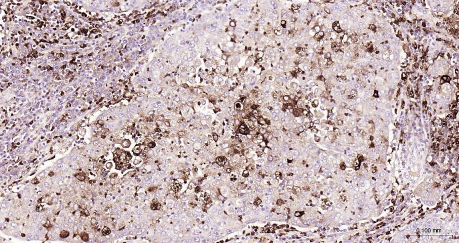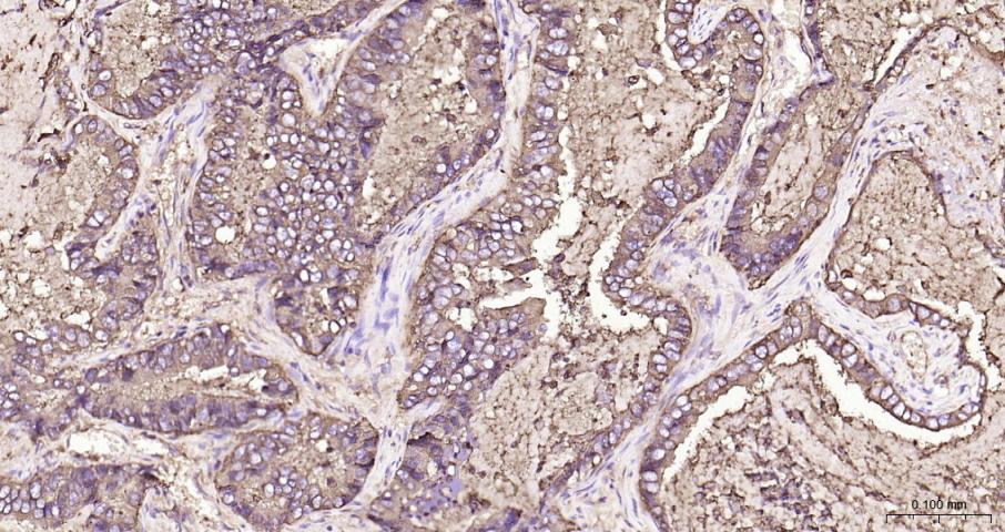 Paraformaldehyde-fixed, paraffin embedded Human Lung Cancer; Antigen retrieval by boiling in sodium citrate buffer (pH6.0) for 15 min; Antibody incubation with CEACAM5 Monoclonal Antibody, Unconjugated(bsm-61419R) at 1:200 overnight at 4°C, followed by conjugation to the bs-0295G-HRP and DAB (C-0010) staining.