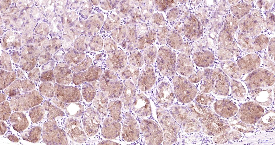 Paraformaldehyde-fixed, paraffin embedded Human stomach; Antigen retrieval by boiling in sodium citrate buffer (pH6.0) for 15 min; Antibody incubation with TAC1 Monoclonal Antibody, Unconjugated (bsm-61420R) at 1:200 overnight at 4°C, followed by conjugation to the bs-0295G-HRP and DAB (C-0010) staining.
