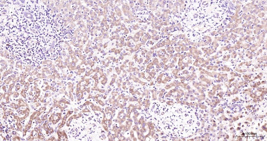 Paraformaldehyde-fixed, paraffin embedded Rat liver; Antigen retrieval by boiling in sodium citrate buffer (pH6.0) for 15 min; Antibody incubation with BNIP3 Monoclonal Antibody, Unconjugated(bsm-61440R) at 1:200 overnight at 4°C, followed by conjugation to the bs-0295G-HRP and DAB (C-0010) staining.