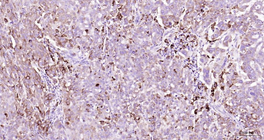Paraformaldehyde-fixed, paraffin embedded Human Ovarian Cancer; Antigen retrieval by boiling in sodium citrate buffer (pH6.0) for 15 min; Antibody incubation with Cathepsin B Monoclonal Antibody, Unconjugated(bsm-61441R) at 1:200 overnight at 4°C, followed by conjugation to the bs-0295G-HRP and DAB (C-0010) staining.