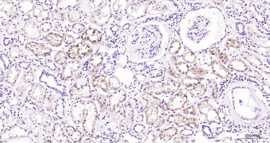 Paraformaldehyde-fixed, paraffin embedded Human Kidney; Antigen retrieval by boiling in sodium citrate buffer (pH6.0) for 15 min; Antibody incubation with Cathepsin B Monoclonal Antibody, Unconjugated(bsm-61441R) at 1:200 overnight at 4°C, followed by conjugation to the bs-0295G-HRP and DAB (C-0010) staining.