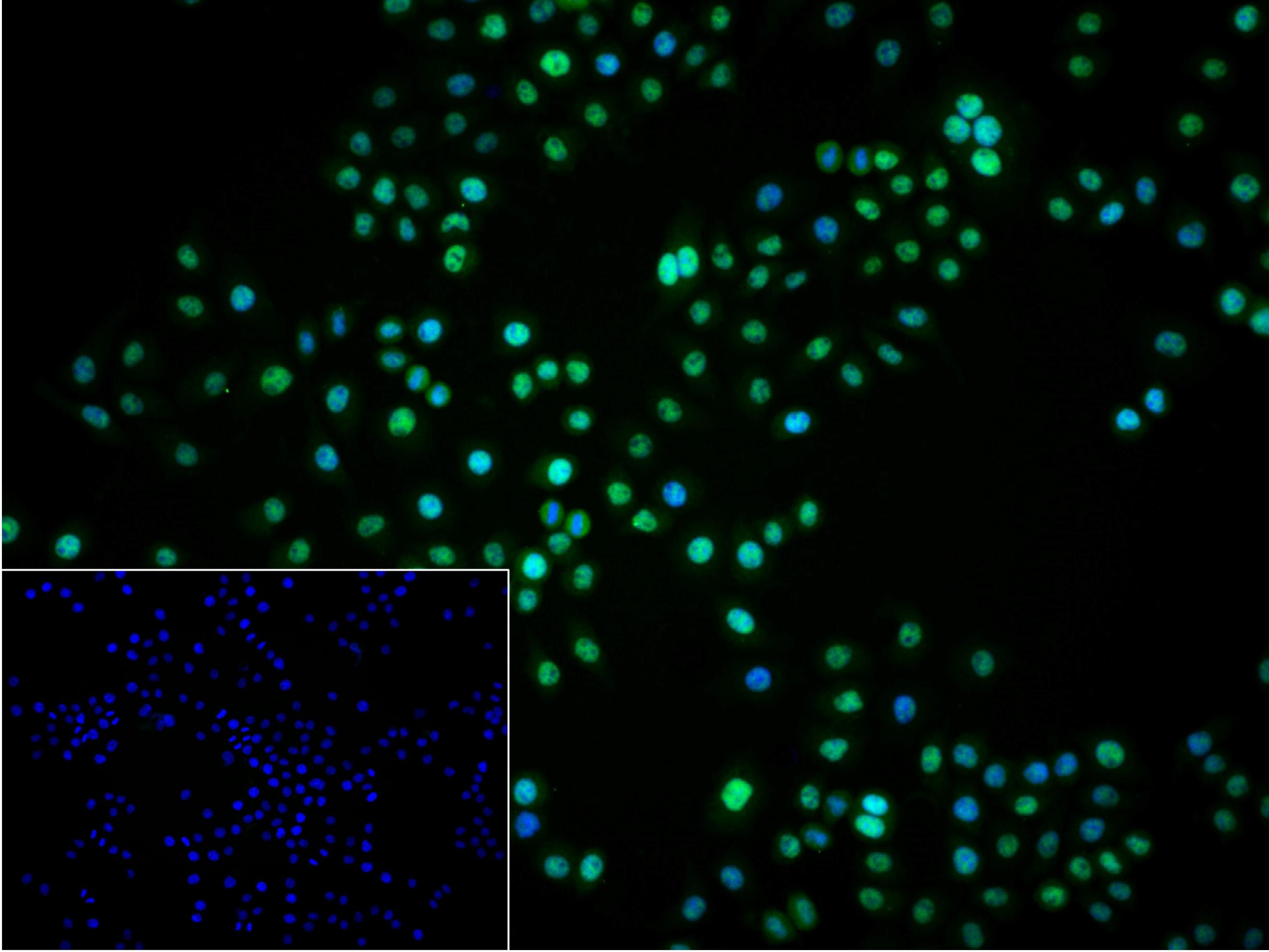 4% Paraformaldehyde-fixed Hela (H) cell; Triton X-100 at r.t. for 20 min; Antibody incubation with (PRMT1) monoclonal Antibody, unconjugated (bsm-61453R) 1:100, 90 min at 37°C; followed by conjugated Goat Anti-Rabbit IgG antibody (green, bs-60295G-BF488) at 37°C for 90 min, DAPI (blue, C02-04002) was used to stain the cell nuclei. PBS instead of the primary antibody was used as the blank control.