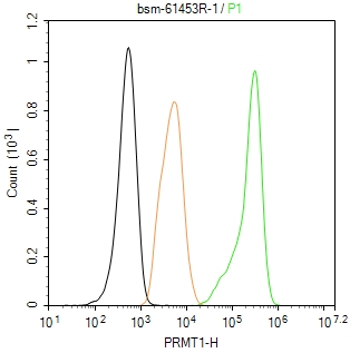 The Hela (H) cells were fixed with 4% PFA (10 min at r.t.) and then permeabilized with 90% ice-cold methanol for 20 min at -20℃,the cells then were incubated in 5%BSA to block non-specific protein-protein interactions (30 min at r.t.), followed by secondary antibody incubation for 40 min at room temperature. Primary Antibody (green):Rabbit Anti-PRMT1 antibody (bsm-61453R,1:100); Isotype Control (orange): Rabbit IgG (bs-0295P). Blank control (black): PBS. Acquisition of 20,000 events was performed.