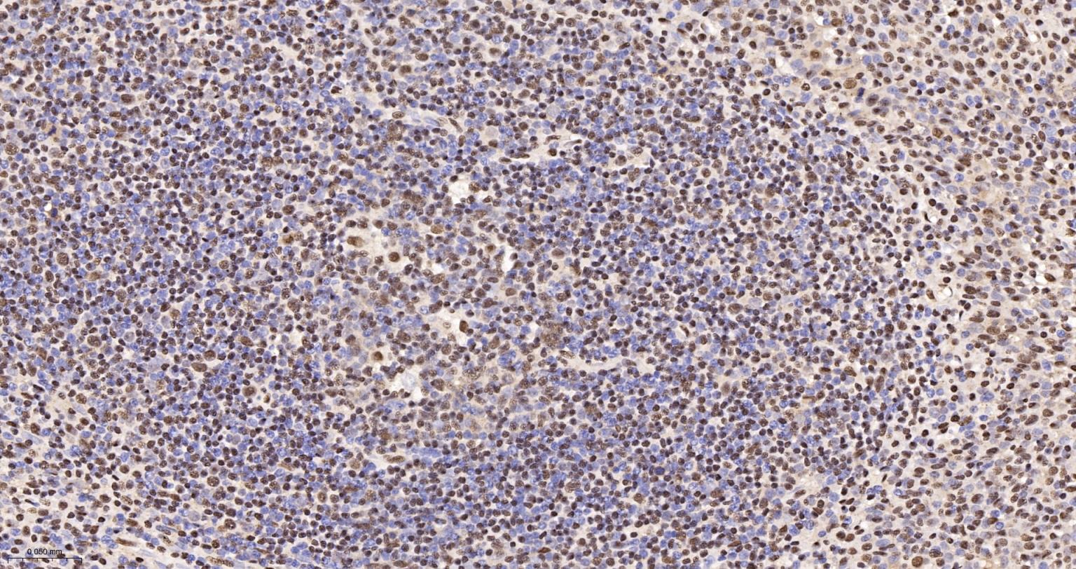 Paraformaldehyde-fixed, paraffin embedded Human Tonsil; Antigen retrieval by boiling in sodium citrate buffer (pH6.0) for 15 min; The section was incubated with Ku70 / XRCC6 Monoclonal Antibody, Unconjugated (bsm-61460R) at 1:200 overnight at 4°C, followed by conjugation to the bs-0295G-HRP and DAB (C-0010) staining.