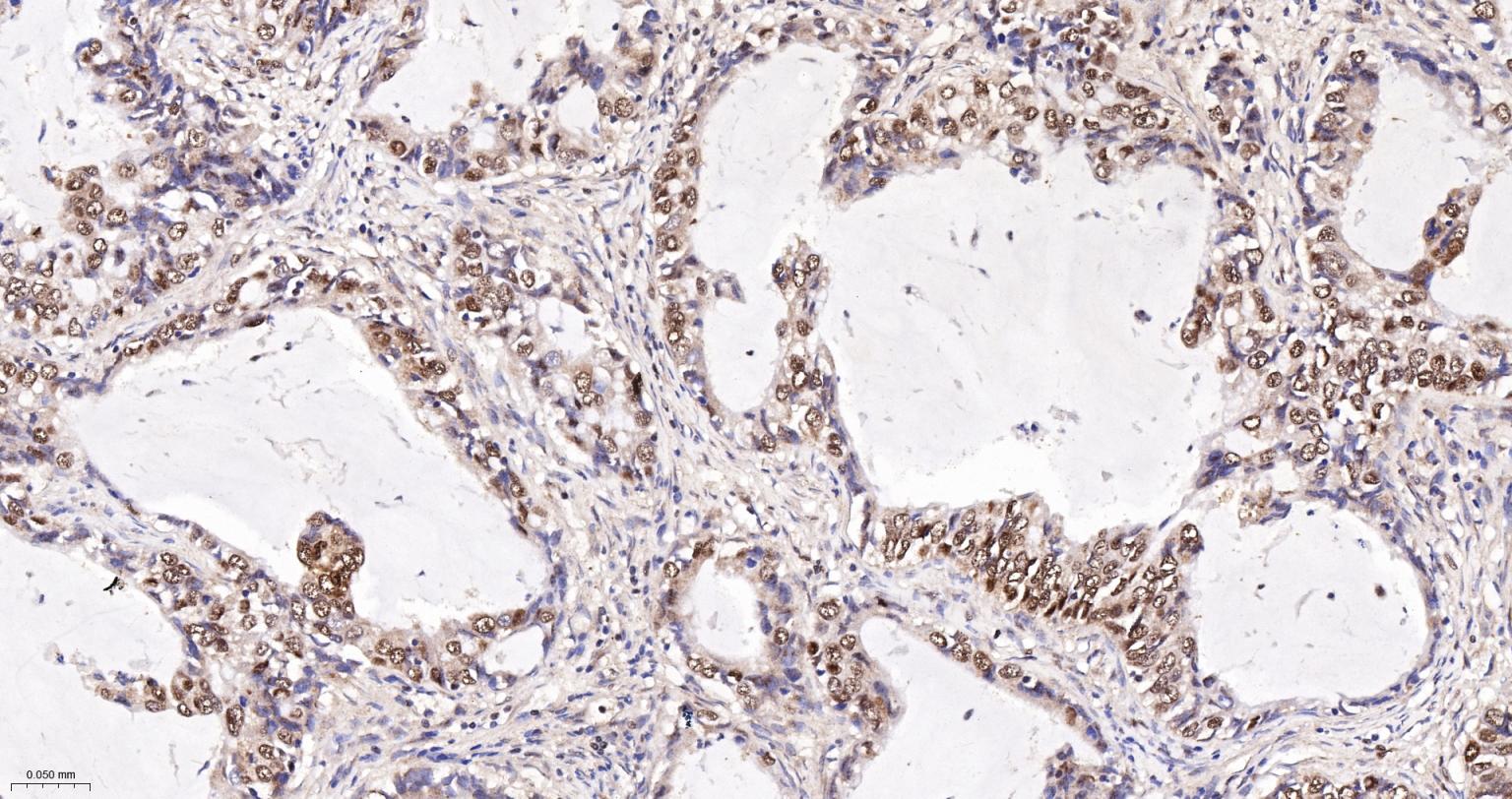 Paraformaldehyde-fixed, paraffin embedded Human Lung Cancer; Antigen retrieval by boiling in sodium citrate buffer (pH6.0) for 15 min; The section was incubated with Ku70 / XRCC6 Monoclonal Antibody, Unconjugated (bsm-61460R) at 1:200 overnight at 4°C, followed by conjugation to the bs-0295G-HRP and DAB (C-0010) staining.