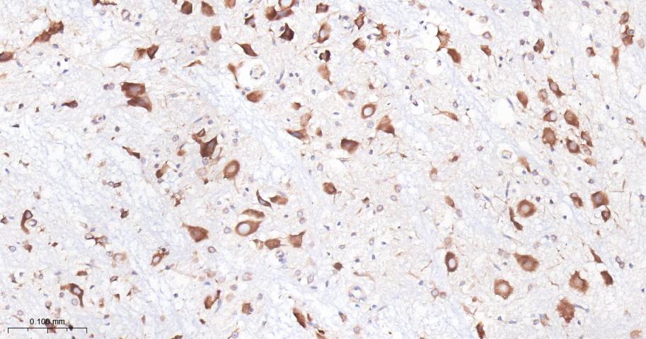 Paraformaldehyde-fixed, paraffin embedded Rat Spinal Cord; Antigen retrieval by boiling in sodium citrate buffer (pH6.0) for 15 min; Antibody incubation with FMR1 Monoclonal Antibody, Unconjugated(bsm-61466R) at 1:100 overnight at 4°C, followed by conjugation to the bs-0295G-HRP and DAB (C-0010) staining.