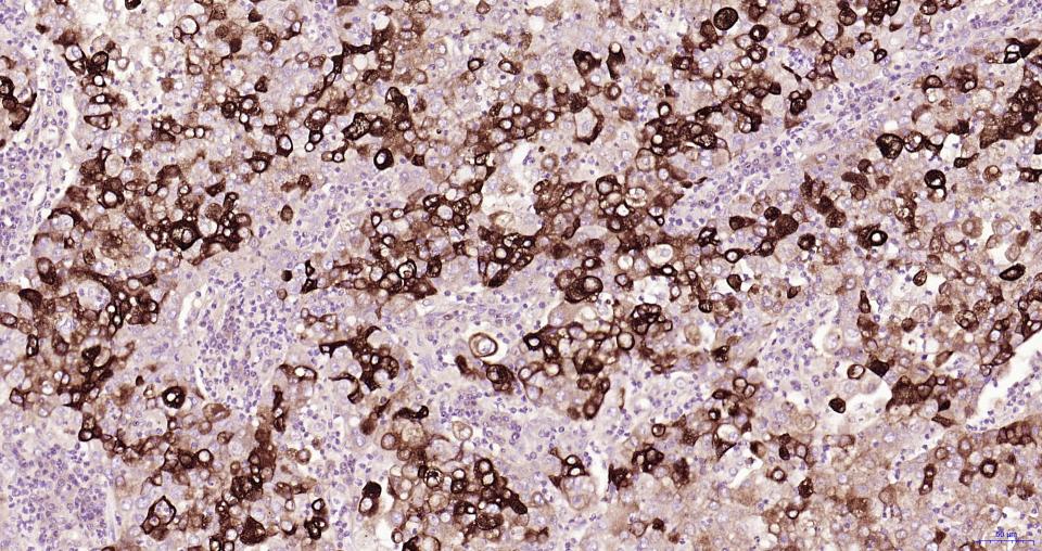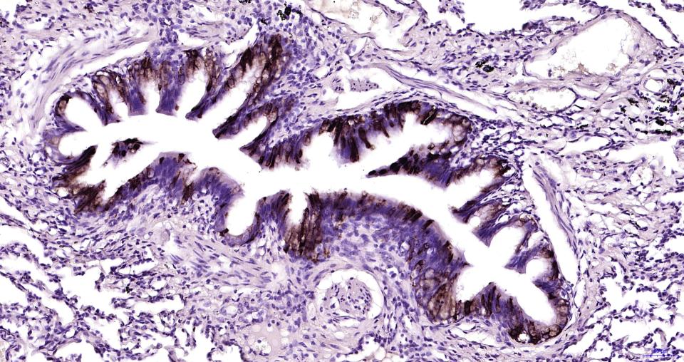 Paraformaldehyde-fixed, paraffin embedded Human Lung; Antigen retrieval by boiling in sodium citrate buffer (pH6.0) for 15 min; Antibody incubation with MUC5AC Monoclonal Antibody, Unconjugated(bsm-61467R) at 1:200 overnight at 4°C, followed by conjugation to the SP Kit(Rabbit, SP-0023) and DAB (C-0010) staining.