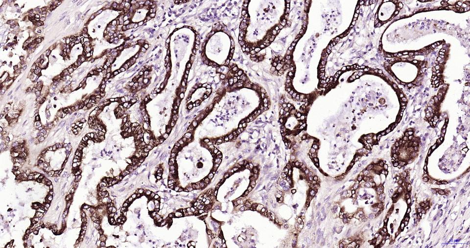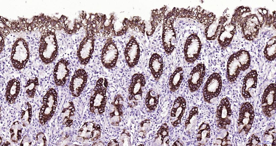 Paraformaldehyde-fixed, paraffin embedded Human Colon Cancer; Antigen retrieval by boiling in sodium citrate buffer (pH6.0) for 15 min; Antibody incubation with MUC5AC Monoclonal Antibody, Unconjugated(bsm-61467R) at 1:200 overnight at 4°C, followed by conjugation to the SP Kit(Rabbit, SP-0023) and DAB (C-0010) staining.