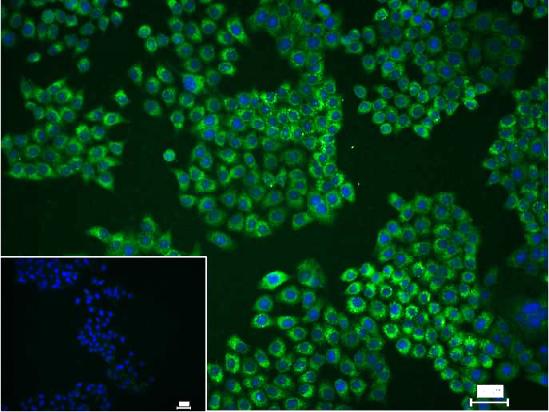 4% Paraformaldehyde-fixed MCF-7 (H) cell; Triton X-100 at r.t. for 20 min; Antibody incubation with (MUC5AC) monoclonal Antibody, unconjugated (bsm-61467R) 1:100, 90 min at 37°C; followed by conjugated Goat Anti-Rabbit IgG antibody (green, bs-60295G-FITC) at 37°C for 90 min, DAPI (blue, C02-04002) was used to stain the cell nuclei. PBS instead of the primary antibody was used as the blank control.