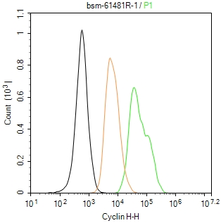 The Hela (H) cells were fixed with 4% PFA (10 min at r.t.) and then permeabilized with 90% ice-cold methanol for 20 min at -20℃,the cells then were incubated in 5%BSA to block non-specific protein-protein interactions (30 min at r.t.), followed by secondary antibody incubation for 40 min at room temperature. Primary Antibody (green):Rabbit Anti-Cyclin H antibody (bsm-61481R,1:100); Isotype Control (orange): Rabbit IgG (bs-0295P). Blank control (black): PBS. Acquisition of 20,000 events was performed.