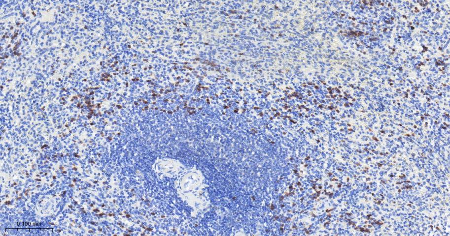 Paraformaldehyde-fixed, paraffin embedded Human Spleen; Antigen retrieval by boiling in sodium citrate buffer (pH6.0) for 15 min; Antibody incubation with cIAP1 Monoclonal Antibody, Unconjugated(bsm-61518R) at 1:200 overnight at 4°C, followed by conjugation to the bs-0295G-HRP and DAB (C-0010) staining.