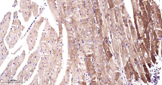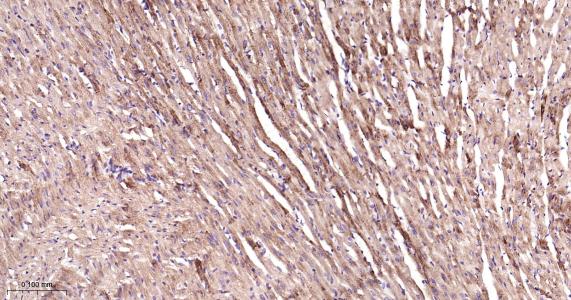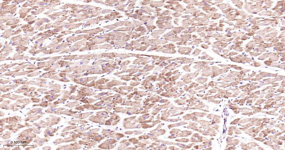 Paraformaldehyde-fixed, paraffin embedded Rat Heart; Antigen retrieval by boiling in sodium citrate buffer (pH6.0) for 15 min; Antibody incubation with HSD17B10 Monoclonal Antibody, Unconjugated(bsm-61523R) at 1:200 overnight at 4°C, followed by conjugation to the bs-0295G-HRP and DAB (C-0010) staining.