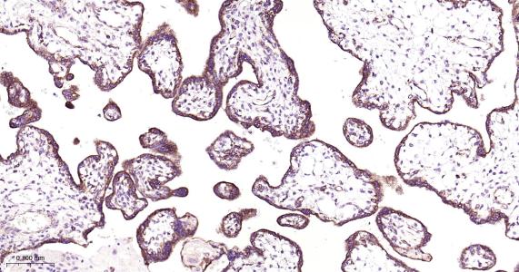 Paraformaldehyde-fixed, paraffin embedded Human Placenta; Antigen retrieval by boiling in sodium citrate buffer (pH6.0) for 15 min; Antibody incubation with HSD17B10 Monoclonal Antibody, Unconjugated(bsm-61523R) at 1:200 overnight at 4°C, followed by conjugation to the bs-0295G-HRP and DAB (C-0010) staining.