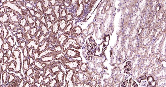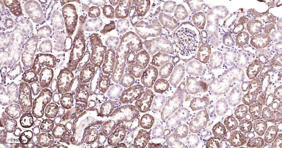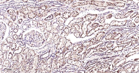 Paraformaldehyde-fixed, paraffin embedded Rat Kidney; Antigen retrieval by boiling in sodium citrate buffer (pH6.0) for 15 min; Antibody incubation with HSD17B10 Monoclonal Antibody, Unconjugated(bsm-61523R) at 1:200 overnight at 4°C, followed by conjugation to the bs-0295G-HRP and DAB (C-0010) staining.