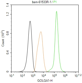 The Hela (H) cells were fixed with 4% PFA (10 min at r.t.) and then permeabilized with 90% ice-cold methanol for 20 min at -20℃,the cells then were incubated in 5%BSA to block non-specific protein-protein interactions (30 min at r.t.), followed by secondary antibody incubation for 40 min at room temperature. Primary Antibody (green):Rabbit Anti-GOLGA1 antibody (bsm-61533R,1:100); Isotype Control (orange): Rabbit IgG (bs-0295P). Blank control (black): PBS. Acquisition of 20,000 events was performed.