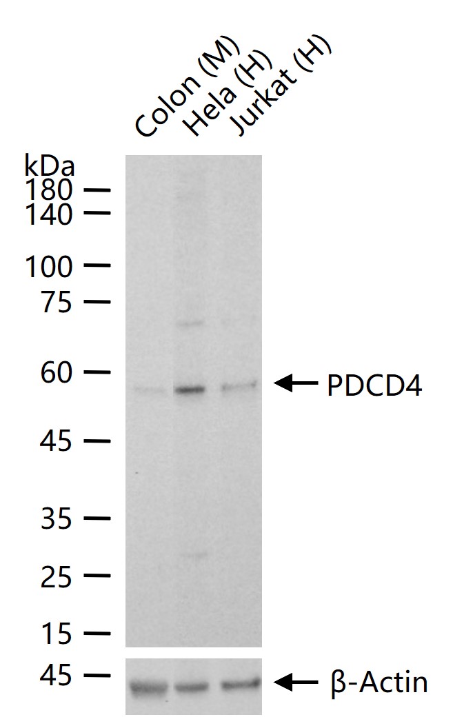 25 ug total protein per lane of various lysates (see on figure) probed with PDCD4 monoclonal antibody, unconjugated (bsm-61534R) at 1:2000 dilution and 4°C overnight incubation. Followed by conjugated secondary antibody incubation at r.t. for 60 min.