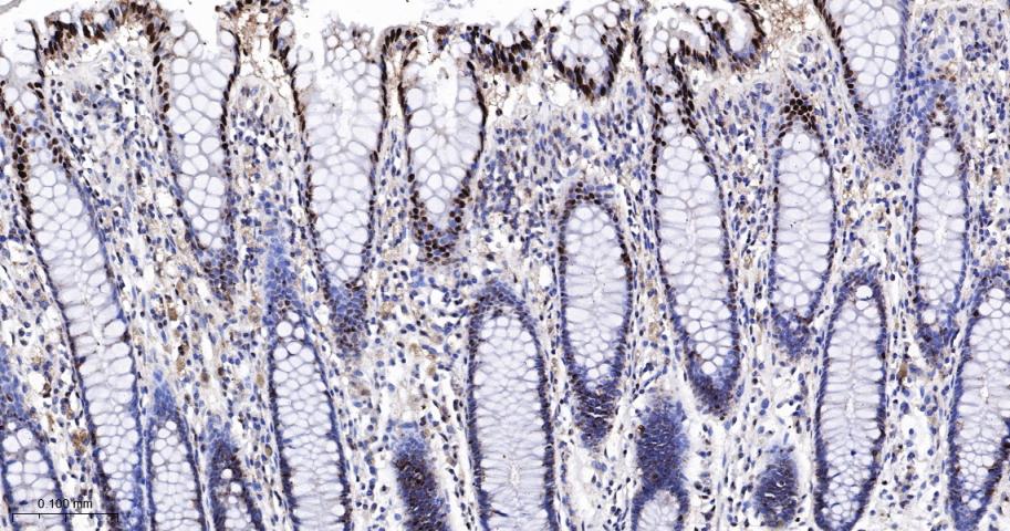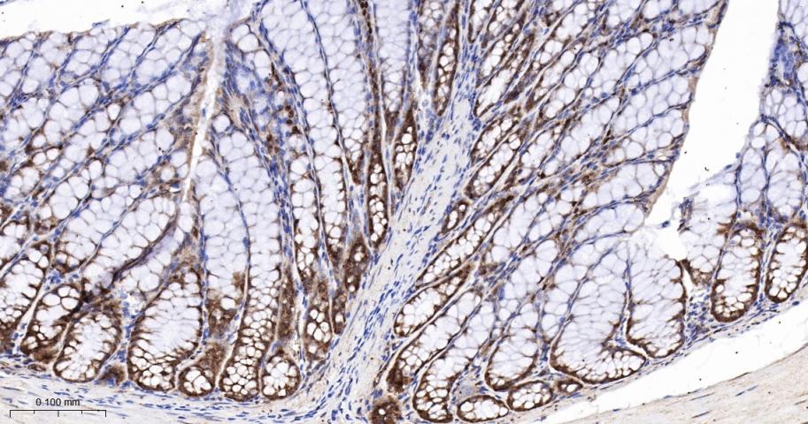 Paraformaldehyde-fixed, paraffin embedded Mouse Colon; Antigen retrieval by boiling in sodium citrate buffer (pH6.0) for 15 min; The section was incubated with PDCD4 Monoclonal Antibody, Unconjugated (bsm-61534R) at 1:200 overnight at 4°C, followed by conjugation to the bs-0295G-HRP and DAB (C-0010) staining.