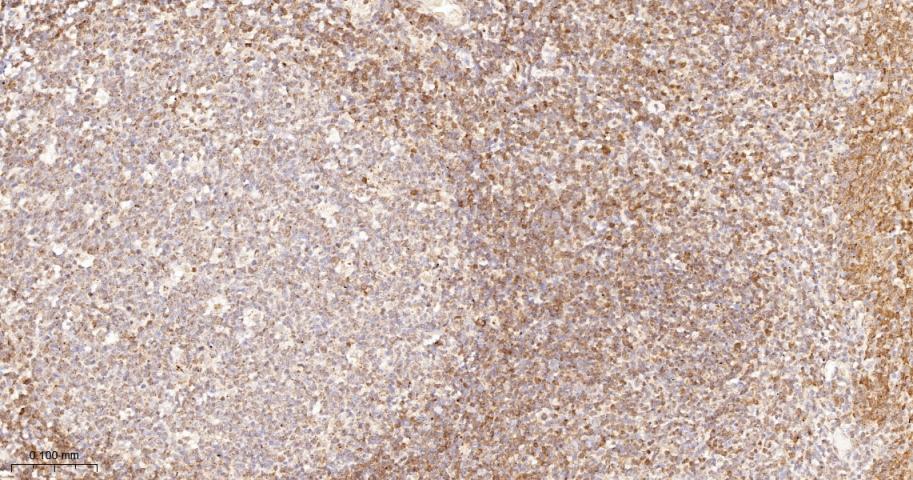 Paraformaldehyde-fixed, paraffin embedded Human Tonsil; Antigen retrieval by boiling in sodium citrate buffer (pH6.0) for 15 min; The section was incubated with PDCD4 Monoclonal Antibody, Unconjugated (bsm-61534R) at 1:200 overnight at 4°C, followed by conjugation to the bs-0295G-HRP and DAB (C-0010) staining.