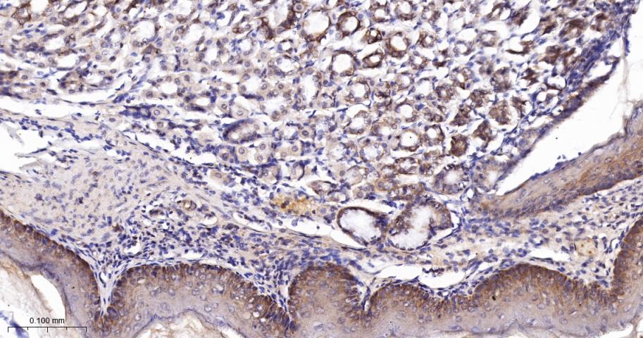 Paraformaldehyde-fixed, paraffin embedded Mouse Stomach; Antigen retrieval by boiling in sodium citrate buffer (pH6.0) for 15 min; The section was incubated with PDCD4 Monoclonal Antibody, Unconjugated (bsm-61534R) at 1:200 overnight at 4°C, followed by conjugation to the bs-0295G-HRP and DAB (C-0010) staining.