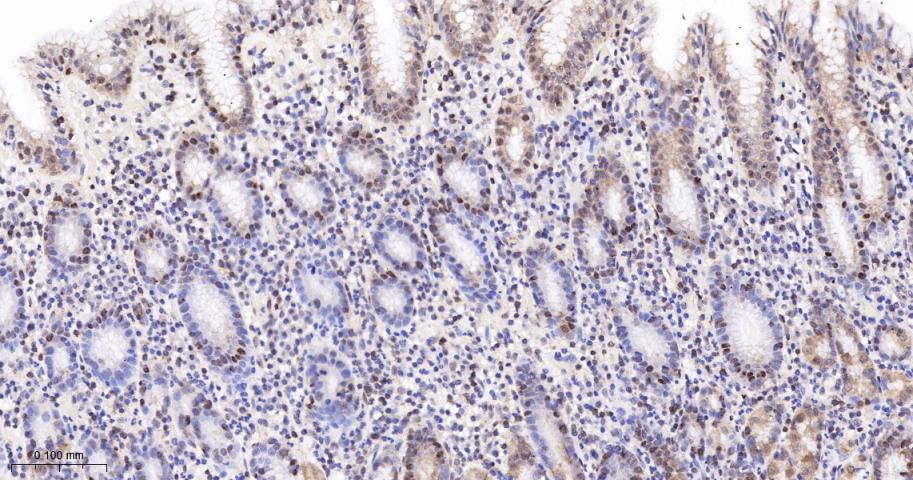 Paraformaldehyde-fixed, paraffin embedded Human Stomach; Antigen retrieval by boiling in sodium citrate buffer (pH6.0) for 15 min; The section was incubated with PDCD4 Monoclonal Antibody, Unconjugated (bsm-61534R) at 1:200 overnight at 4°C, followed by conjugation to the bs-0295G-HRP and DAB (C-0010) staining.