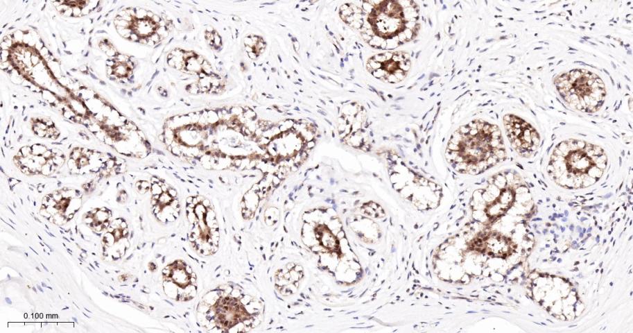 Paraformaldehyde-fixed, paraffin embedded Human Breast Cancer; Antigen retrieval by boiling in sodium citrate buffer (pH6.0) for 15 min; The section was incubated with PDCD4 Monoclonal Antibody, Unconjugated (bsm-61534R) at 1:200 overnight at 4°C, followed by conjugation to the bs-0295G-HRP and DAB (C-0010) staining.