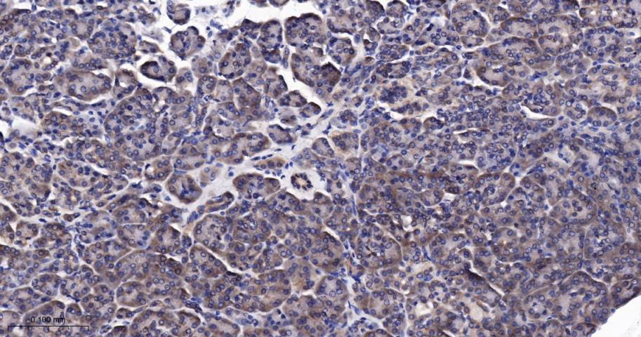 Paraformaldehyde-fixed, paraffin embedded Human Pancreas; Antigen retrieval by boiling in sodium citrate buffer (pH6.0) for 15 min; The section was incubated with RASSF1A Monoclonal Antibody, Unconjugated (bsm-61576R) at 1:200 overnight at 4°C, followed by conjugation to the bs-0295G-HRP and DAB (C-0010) staining.