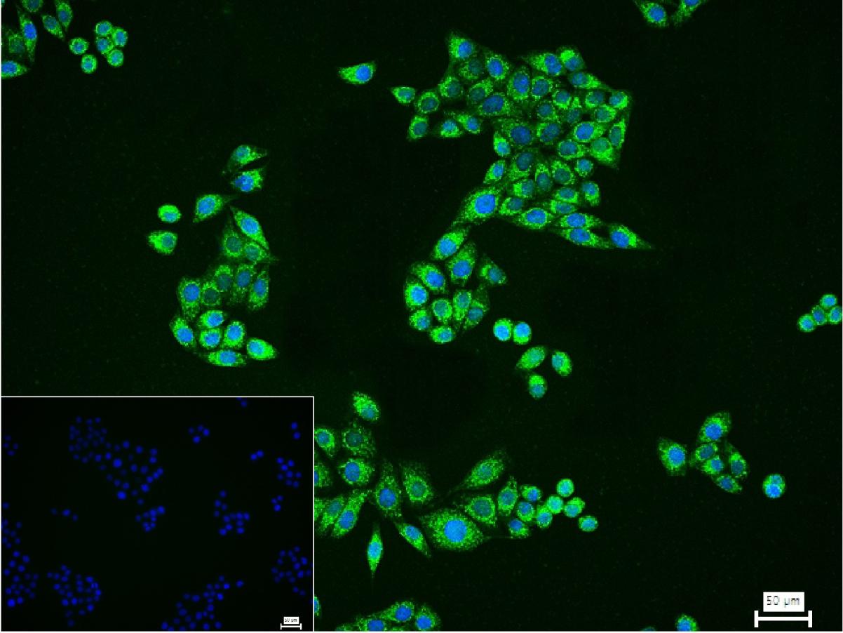 4% Paraformaldehyde-fixed MCF-7 (H) cell; Triton X-100 at r.t. for 20 min; Antibody incubation with (IDH2) monoclonal Antibody, unconjugated (bsm-61585R) 1:100, 90 min at 37°C; followed by conjugated Goat Anti-Rabbit IgG antibody (green, bs-40295G-FITC) at 37°C for 90 min, DAPI (blue, C02-04002) was used to stain the cell nuclei. PBS instead of the primary antibody was used as the blank control.