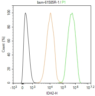 The MCF-7 (H) cells were fixed with 4% PFA (10 min at r.t.) and then permeabilized with 90% ice-cold methanol for 20 min at -20℃,the cells then were incubated in 5%BSA to block non-specific protein-protein interactions (30 min at r.t.).Primary Antibody (green):Rabbit Anti-IDH2 antibody (bsm-61585R,1:100); Isotype Control (orange): Rabbit IgG (bs-0295P). Blank control (black): PBS. Acquisition of 20,000 events was performed.