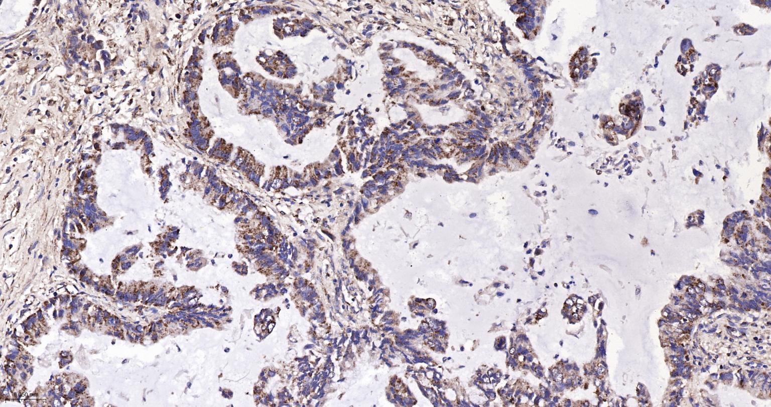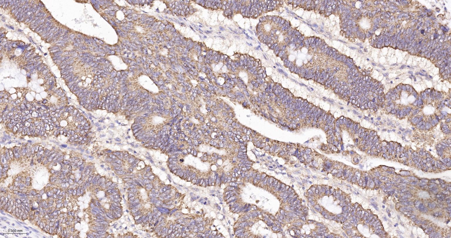 Paraformaldehyde-fixed, paraffin embedded Human Colon Cancer; Antigen retrieval by boiling in sodium citrate buffer (pH6.0) for 15 min; The section was incubated with IDH2 Monoclonal Antibody, Unconjugated (bsm-61585R) at 1:200 overnight at 4°C, followed by conjugation to the bs-0295G-HRP and DAB (C-0010) staining.