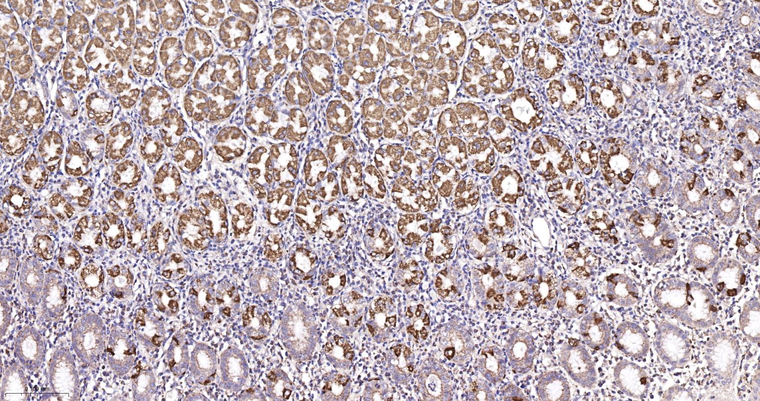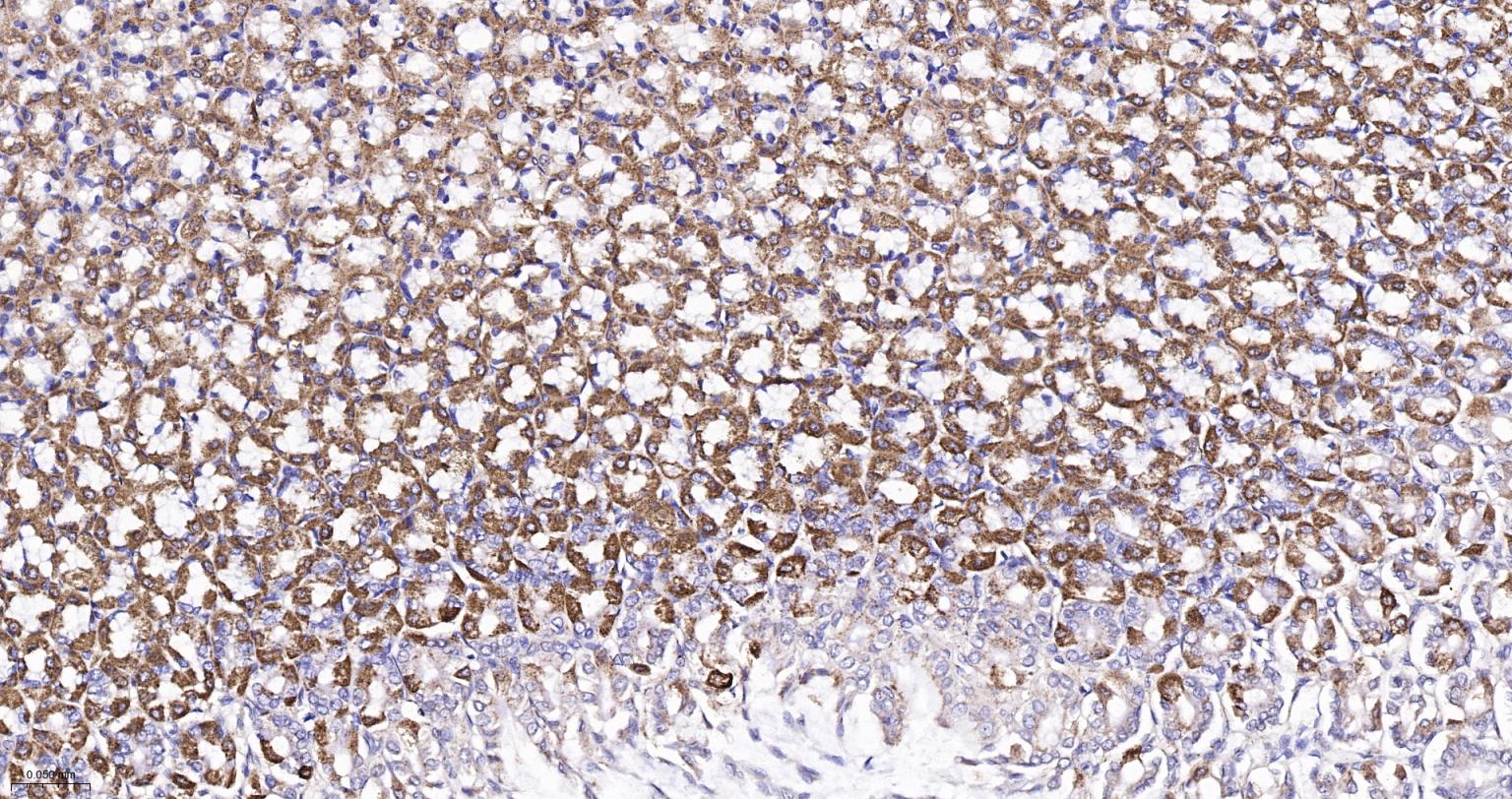 Paraformaldehyde-fixed, paraffin embedded Rat Stomach; Antigen retrieval by boiling in sodium citrate buffer (pH6.0) for 15 min; The section was incubated with IDH2 Monoclonal Antibody, Unconjugated (bsm-61585R) at 1:200 overnight at 4°C, followed by conjugation to the bs-0295G-HRP and DAB (C-0010) staining.