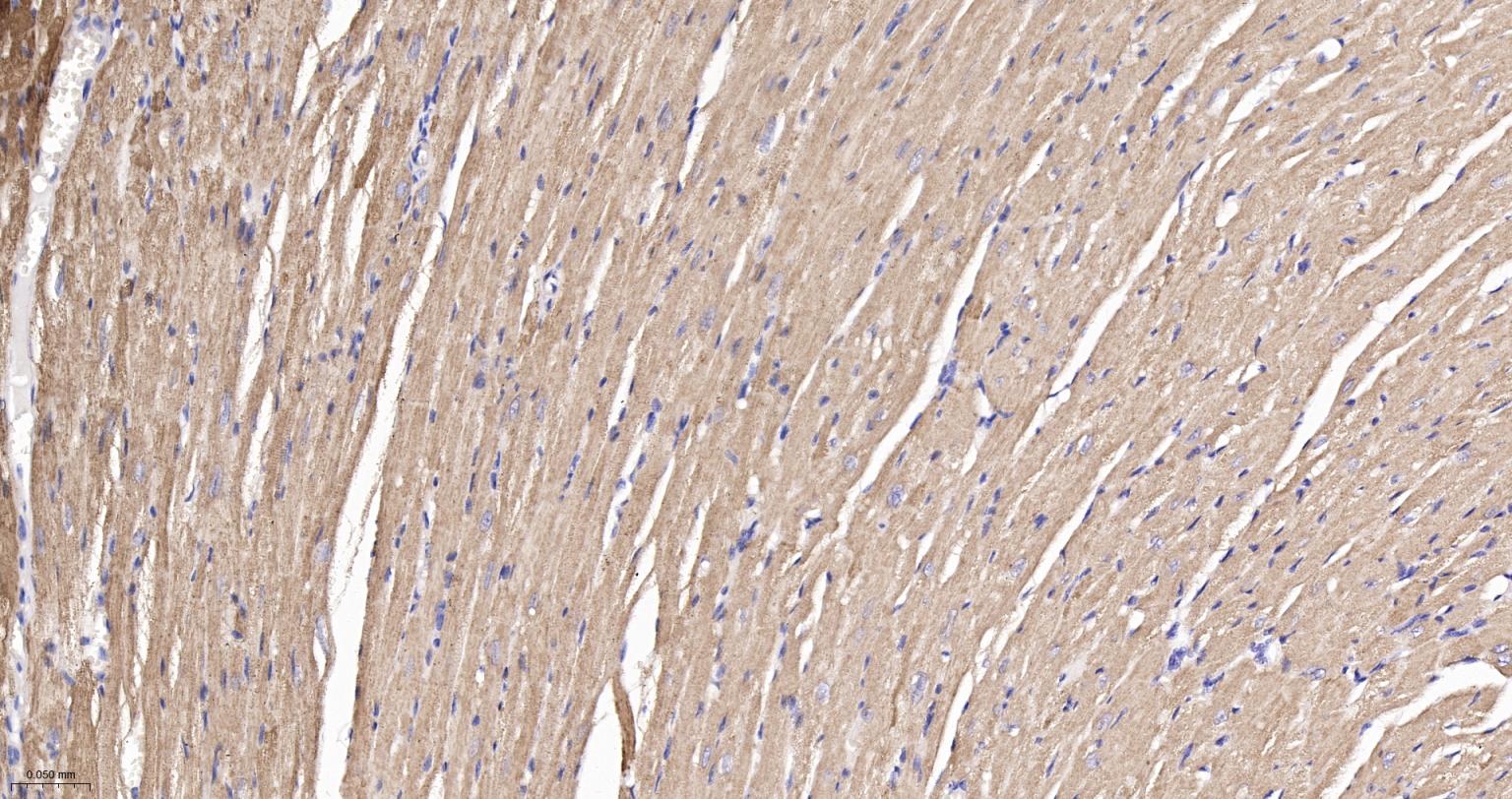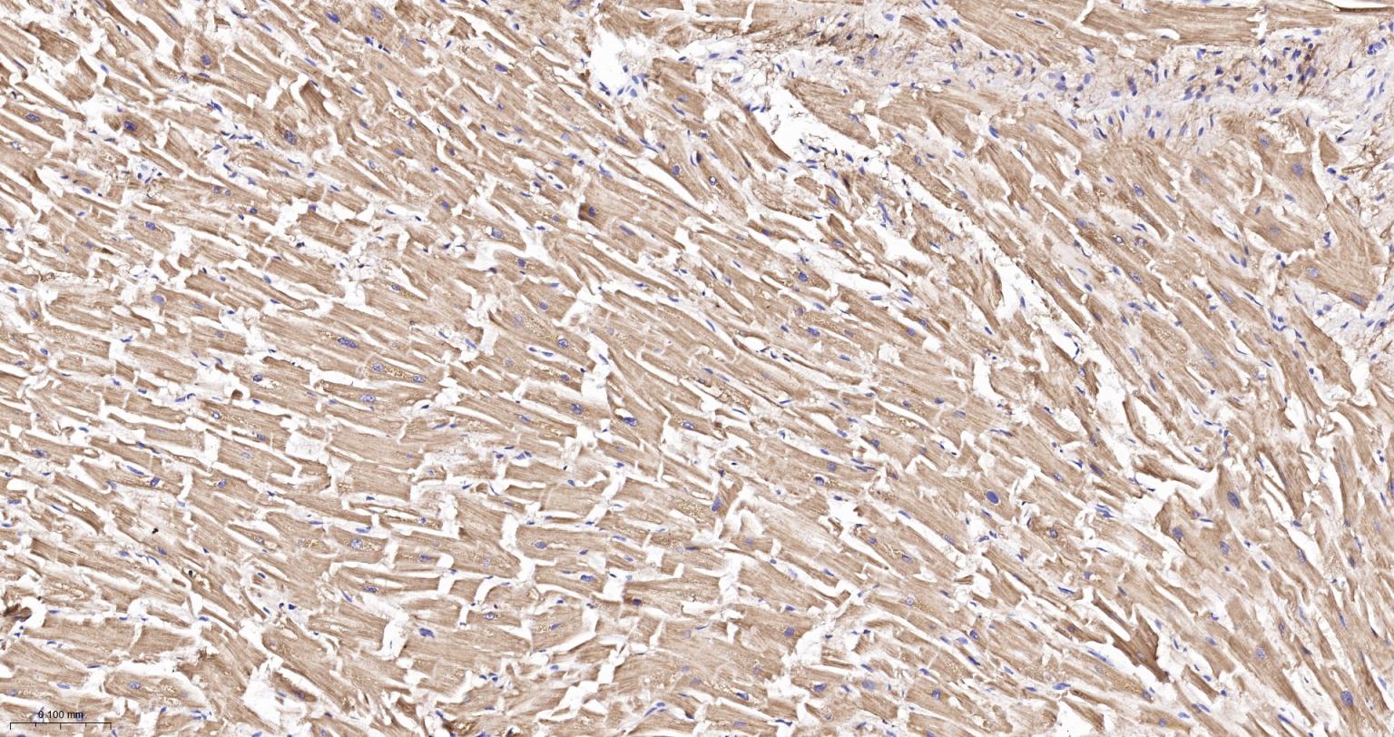 Paraformaldehyde-fixed, paraffin embedded Human Heart; Antigen retrieval by boiling in sodium citrate buffer (pH6.0) for 15 min; The section was incubated with IDH2 Monoclonal Antibody, Unconjugated (bsm-61585R) at 1:200 overnight at 4°C, followed by conjugation to the bs-0295G-HRP and DAB (C-0010) staining.