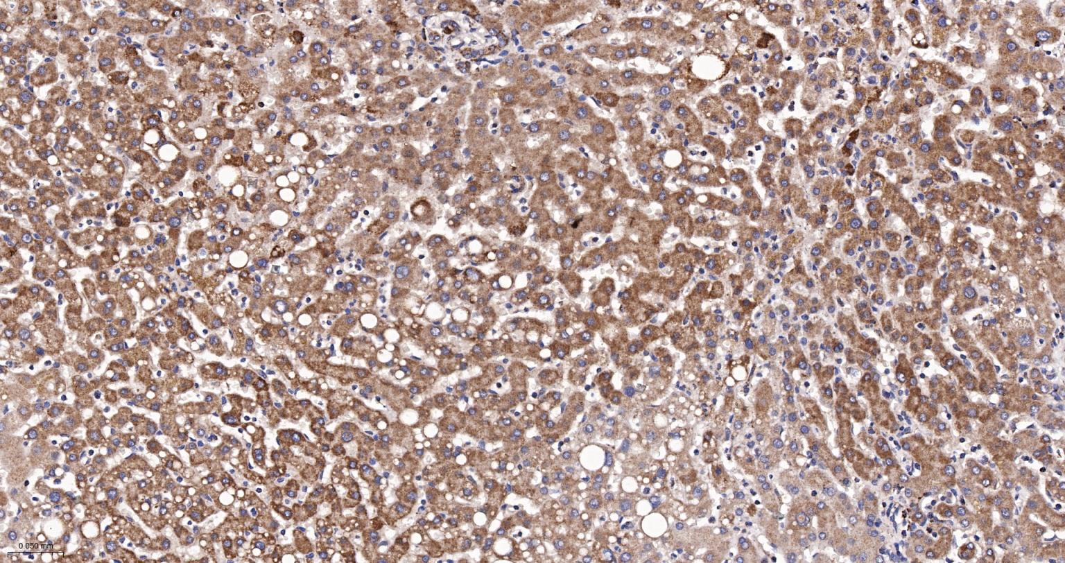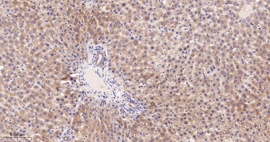 Paraformaldehyde-fixed, paraffin embedded Rat Liver; Antigen retrieval by boiling in sodium citrate buffer (pH6.0) for 15 min; The section was incubated with IDH2 Monoclonal Antibody, Unconjugated (bsm-61585R) at 1:200 overnight at 4°C, followed by conjugation to the bs-0295G-HRP and DAB (C-0010) staining.
