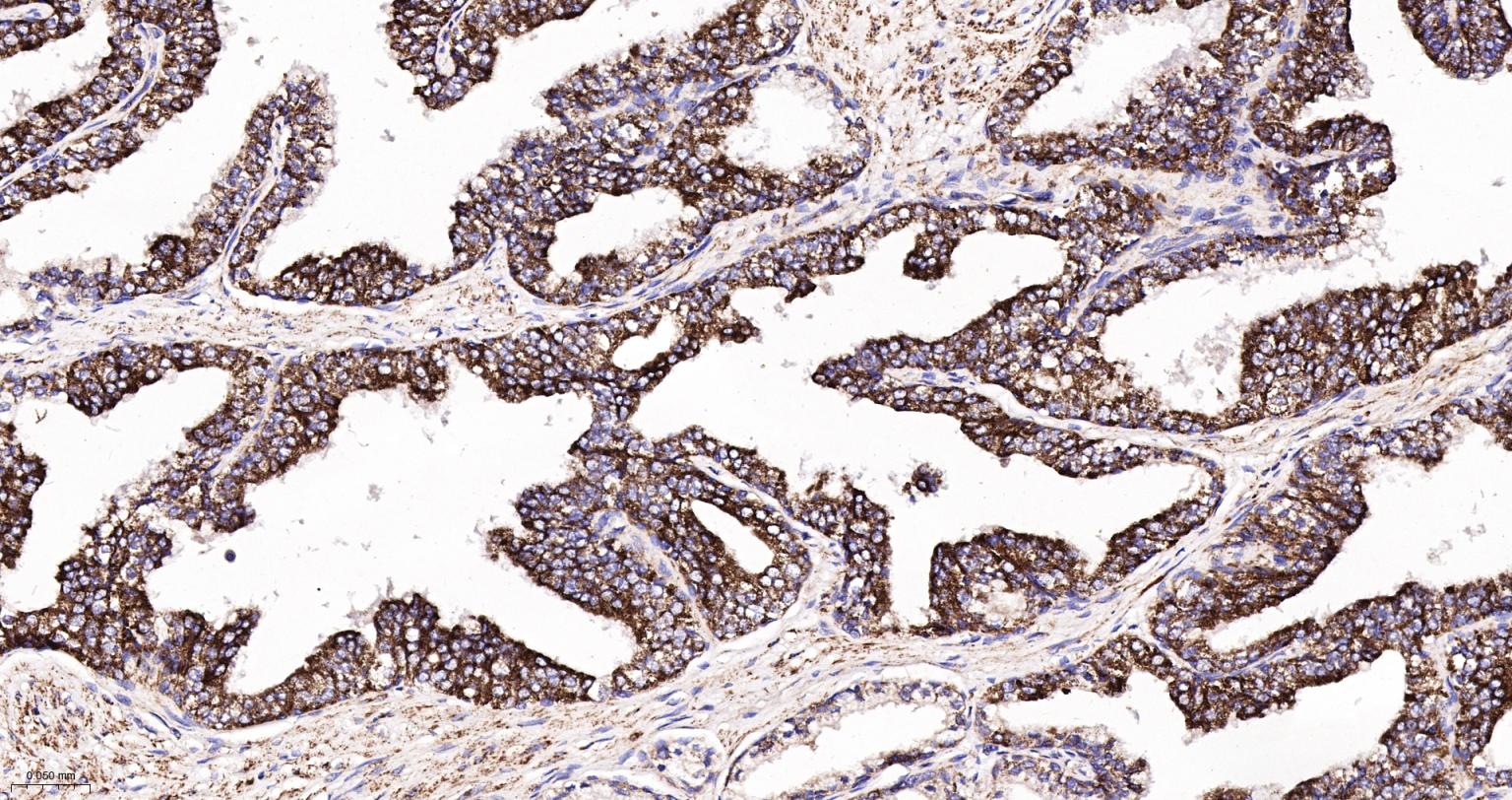 Paraformaldehyde-fixed, paraffin embedded Human Prostate Cancer; Antigen retrieval by boiling in sodium citrate buffer (pH6.0) for 15 min; The section was incubated with IDH2 Monoclonal Antibody, Unconjugated (bsm-61585R) at 1:200 overnight at 4°C, followed by conjugation to the bs-0295G-HRP and DAB (C-0010) staining.