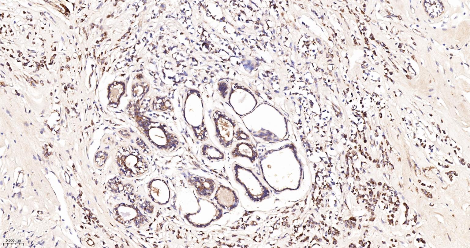 Paraformaldehyde-fixed, paraffin embedded Human Breast Cancer; Antigen retrieval by boiling in sodium citrate buffer (pH6.0) for 15 min; The section was incubated with IDH2 Monoclonal Antibody, Unconjugated (bsm-61585R) at 1:200 overnight at 4°C, followed by conjugation to the bs-0295G-HRP and DAB (C-0010) staining.