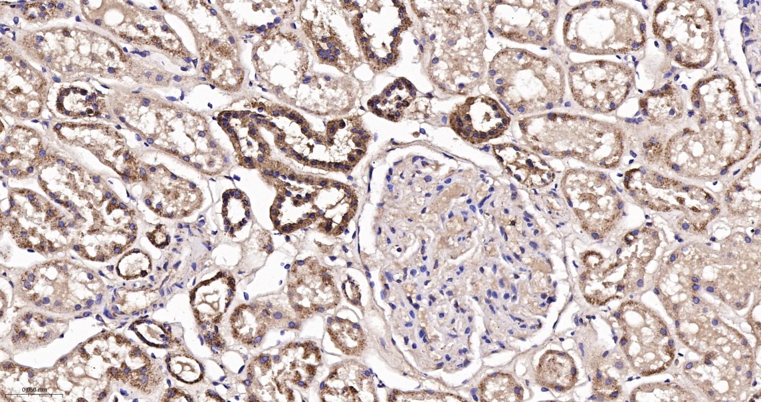 Paraformaldehyde-fixed, paraffin embedded Human Kidney; Antigen retrieval by boiling in sodium citrate buffer (pH6.0) for 15 min; The section was incubated with IDH2 Monoclonal Antibody, Unconjugated (bsm-61585R) at 1:200 overnight at 4°C, followed by conjugation to the bs-0295G-HRP and DAB (C-0010) staining.