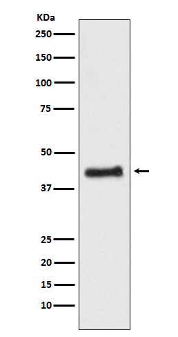 Western blot analysis of HEK293 cell lysate. Using COUP-TF1 (bsm-61615R) monoclonal antibody at 1:1000 dilution and 4°C overnight incubation. Followed by conjugated secondary antibody incubation at r.t. for 60 min.