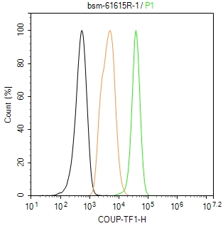 The Hela (H) cells were fixed with 4% PFA (10 min at r.t.) and then permeabilized with 90% ice-cold methanol for 20 min at -20℃,the cells then were incubated in 5%BSA to block non-specific protein-protein interactions (30 min at r.t.), followed by secondary antibody incubation for 40 min at room temperature. Primary Antibody (green):Rabbit Anti-COUP-TF1 antibody (bsm-6165R,1:100); Isotype Control (orange): Rabbit IgG (bs-0295P). Blank control (black): PBS. Acquisition of 20,000 events was performed.