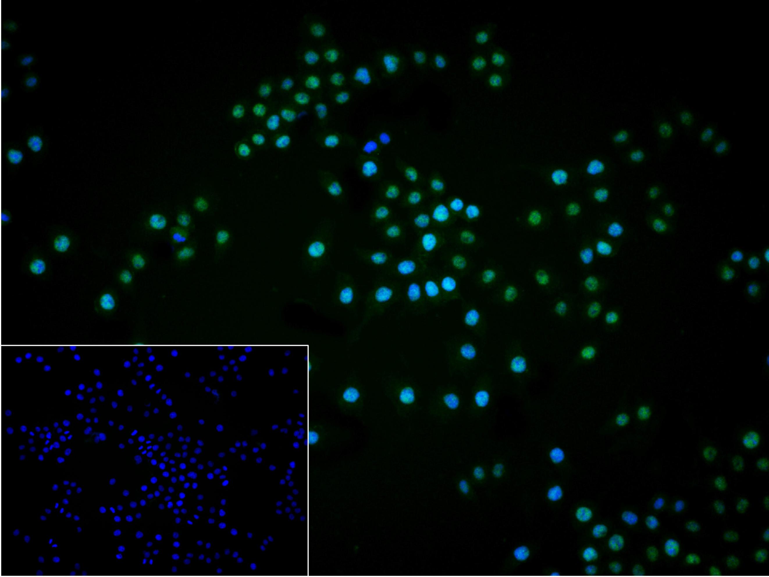 4% Paraformaldehyde-fixed Hela (H) cell; Triton X-100 at r.t. for 20 min; Antibody incubation with (COUP-TF1) monoclonal Antibody, unconjugated (bsm-61615R) 1:100, 90 min at 37°C; followed by conjugated Goat Anti-Rabbit IgG antibody (green, bs-60295G-BF488) at 37°C for 90 min, DAPI (blue, C02-04002) was used to stain the cell nuclei. PBS instead of the primary antibody was used as the blank control.