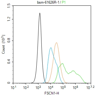 The HepG2 (H) cells were fixed with 4% PFA (10 min at r.t.) and then permeabilized with 90% ice-cold methanol for 20 min at -20℃,the cells then were incubated in 5%BSA to block non-specific protein-protein interactions (30 min at r.t.).Primary Antibody (green):Rabbit Anti-FSCN1 antibody (bsm-61626R,1:100); Secondary Antibody (white blue): Goat anti-Rabbit IgG-BF488 (bs-60295G-BF488): 1 μg/test. Isotype Control (orange): Rabbit IgG (bs-0295P). Blank control (black): PBS. Acquisition of 20,000 events was performed.